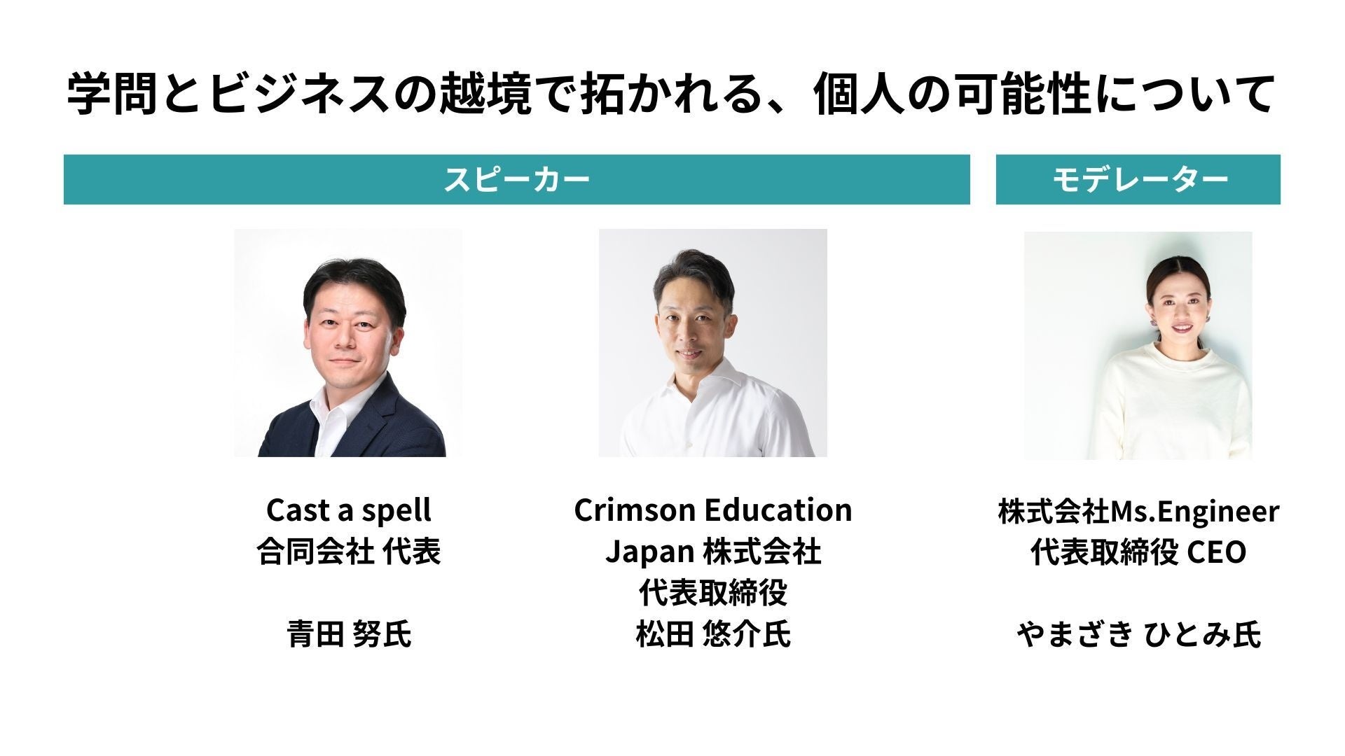 ビジネスと学問を並行しながら活躍を続けられる方々の越境の背景や得られたことについてセッション形式でお話しいただきます。