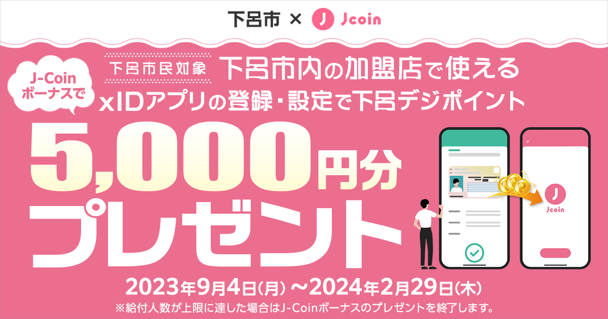 下呂市が指定する「デジタル身分証アプリ(xID)(※1)」の登録・設定をした下呂市民を対象に、先着9,600名にJ-Coinボーナスで5,000円分の「下呂デジポイント」を給付します。