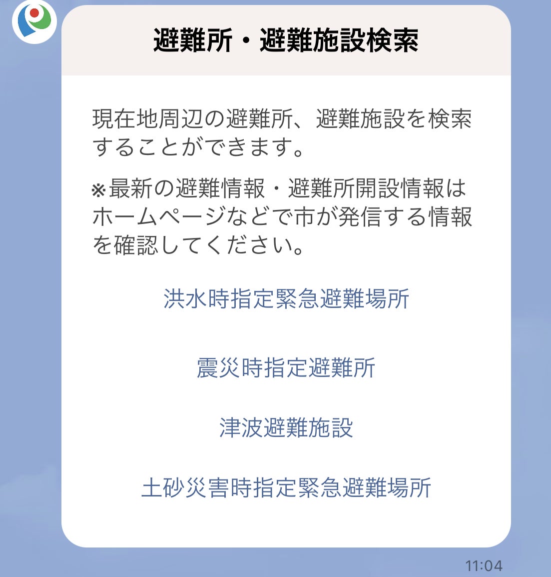 このLINEのリッチメニュー(トーク画面下のメニュー)の防災メニューに「避難所・避難施設検索」の機能を追加しました。