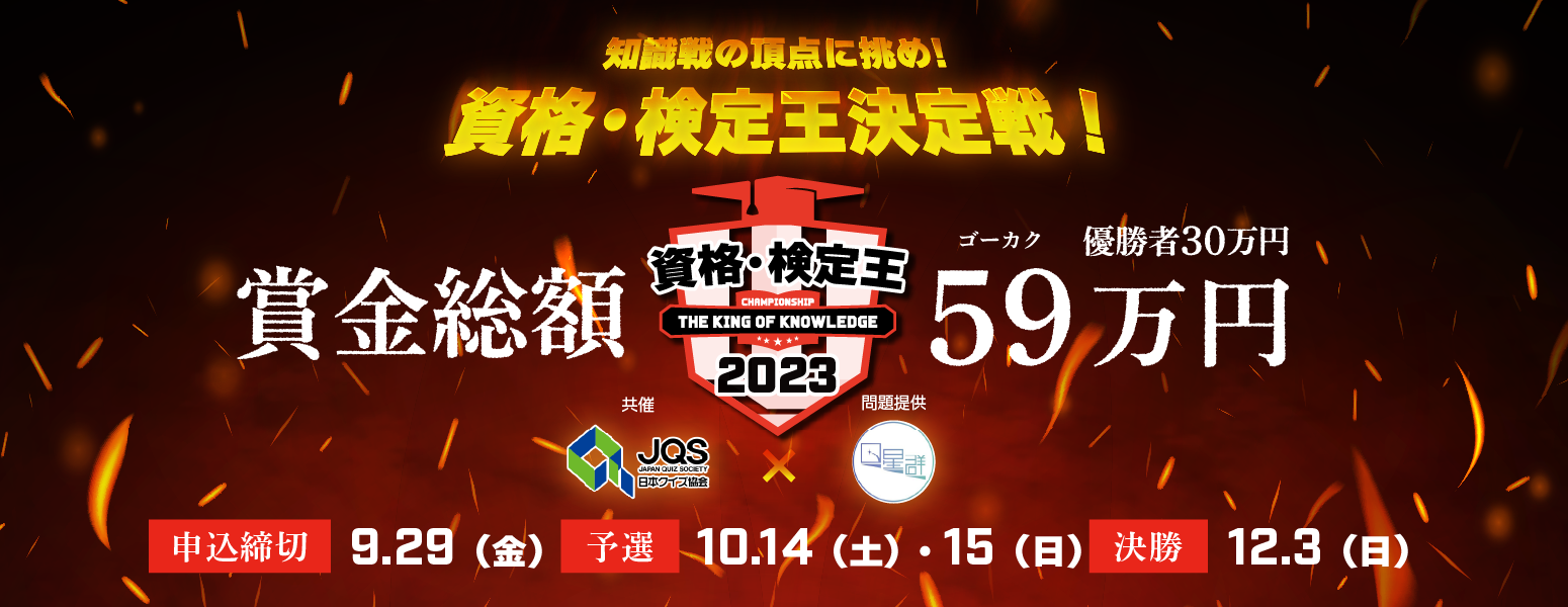 「資格・検定王」とは、ニュース・博識甲子園(全国高等学校総合クイズ大会)などで話題の「日本クイズ協会」、クイズ番組やメディアで活躍中の林輝幸氏が立ち上げたクイズ制作集団「Q星群」の2団体と「日本の資格・検定」がコラボレーションし、資格・検定に関する知識だけでなく、雑学やひらめき力も試される大会です。旧大会をアップデートする形で2021年から開催し、好評により2023年も開催の運びとなりました。