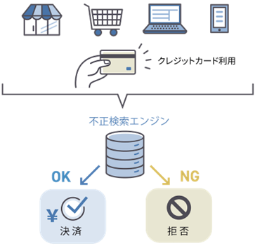 AIモデルを用いて、取引履歴や加盟店情報、クレジットカードの発行会社情報などの多様なデータを基に不正リスクをスコアリングすることで、高精度に不正を検知します。