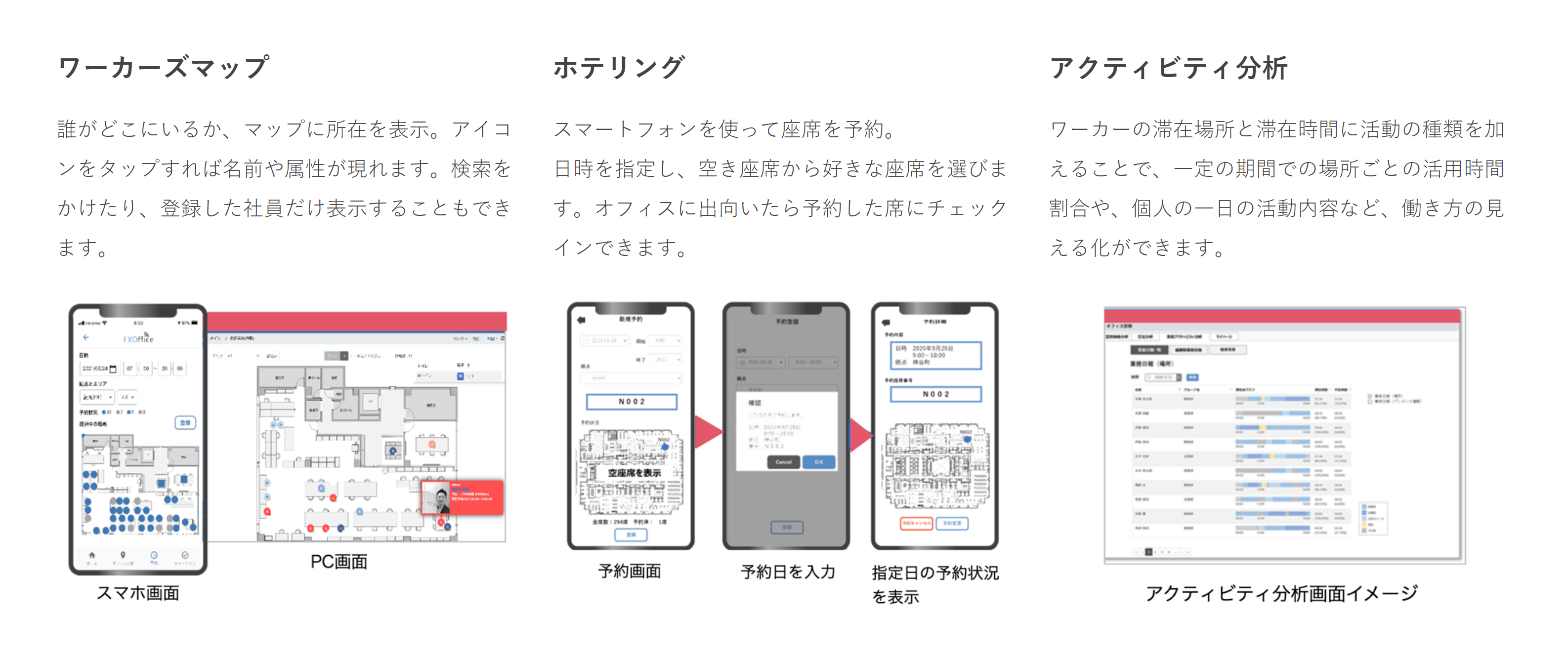 「Workers Trail」(ワーカーズ トレイル)位置情報提供サービスは、株式会社WHEREが提供する性能と信頼性の高いIoTセンサー「EXBeacon」と、それを活用した働き方支援アプリ「EXOffice」をベースに構成し、イトーキが提案する働き方に対する活動分析がしやすくなる機能を一部カスタマイズしたアプリケーションです。 誰がどの場所にいるかが一目でわかる「ワーカーズマップ」や、会議室や座席を予約できる「ホテリング機能」、オフィスの滞在率や場所ごとの活用率などの「アクティビティ分析」の機能を備えています。