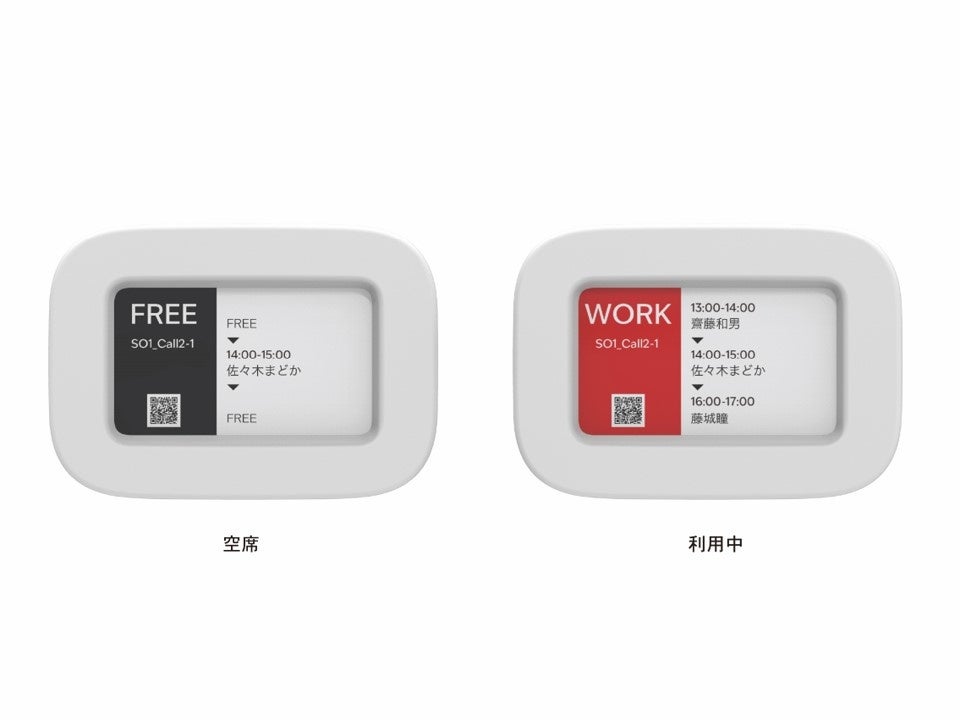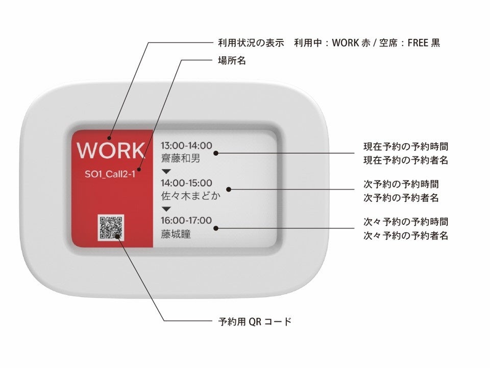 表示画面には電子ペーパーを採用し、空席の場合は画面左側が黒背景で「FREE」に、利用中の場合は赤背景で「WORK」が表示され、現在利用中かどうかが一目で分かる表示になっています。また画面右側にはその日の直近の予約者の名前と予約時間がシンプルに表示されます。(最大3件分)
