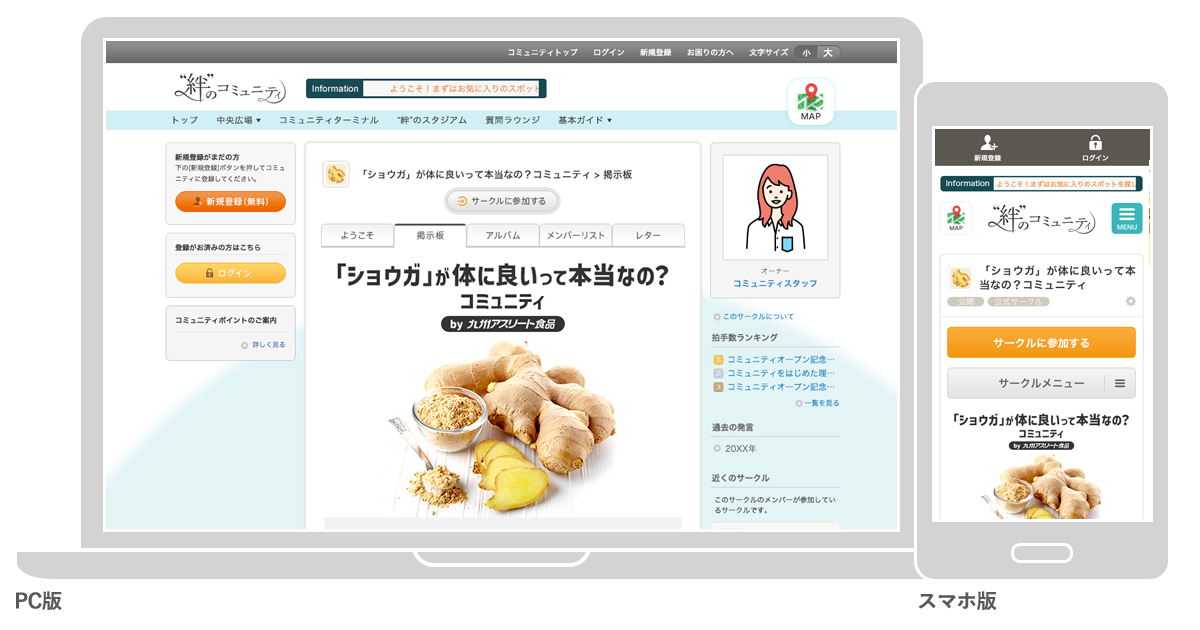 “「ショウガ」が体に良いって本当なの?コミュニティ”は「“絆”のコミュニティ」上に開設されました。「“絆”のコミュニティ」とは2020年1月に開設した、クオンが運営するオンライン上のファンコミュニティプラットフォーム。50以上の企業・自治体と200万人を超える生活者が集い、“絆”をテーマにした交流や、参画企業・団体のコラボレーション企画、双方向コミュニケーションから生まれる生活者の声をもとにした価値共創のイベントなどを実施しています。https://www.beach.jp/community/KIZUNA/