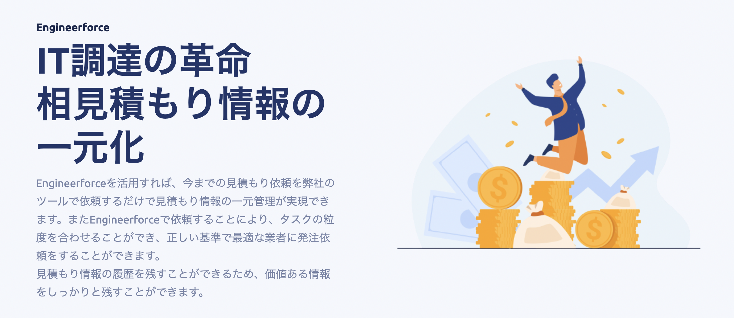株式会社Engineerforce(本社:東京都渋谷区、代表取締役:飯田 佳明、以下「Engineerforce」)は、IT調達、購買部門、SIerへ外注している会社向けに相見積もりの情報を一元管理する新機能をリリースしたことをお知らせします。