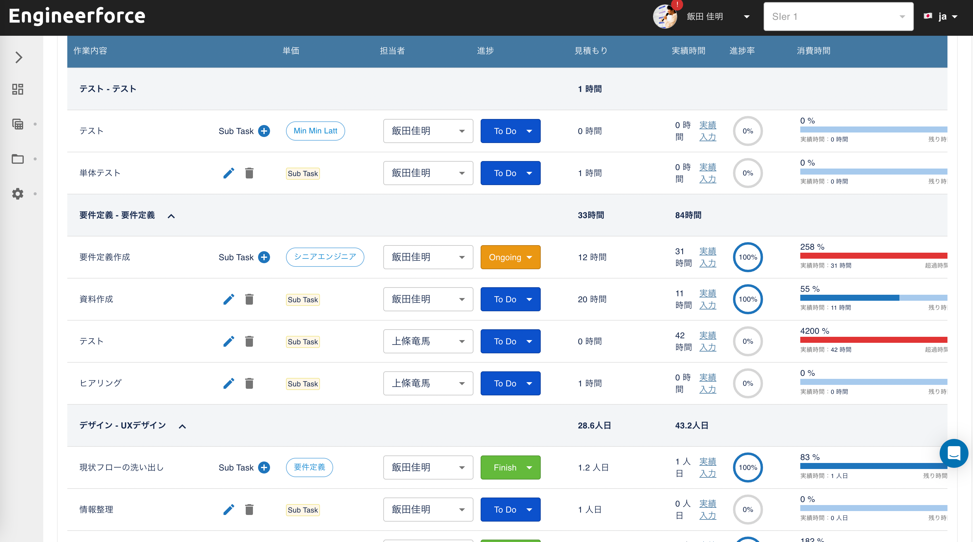 見積もり作成後、プロジェクトの進捗管理、見積もりとの差分を確認することができます。