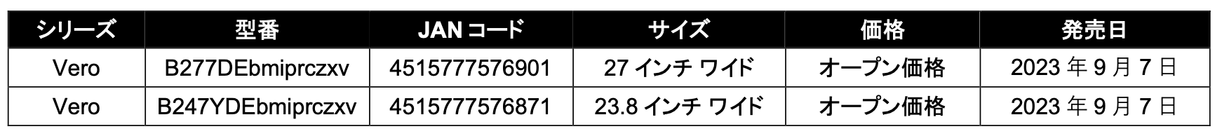 日本エイサー株式会社(本社:東京都新宿区、代表取締役社長:ボブ・セン)は、Acerの統合的なサステナビリティに考慮した取り組みを具現化するサステナブルな製品シリーズAcer Vero(ヴェロ)より、Webカメラを搭載した27インチおよび23.8インチモニター「B277Dbmiprczxv」「B247YDbmiprczxv」を、2023年9月7日(木)に発売します。
