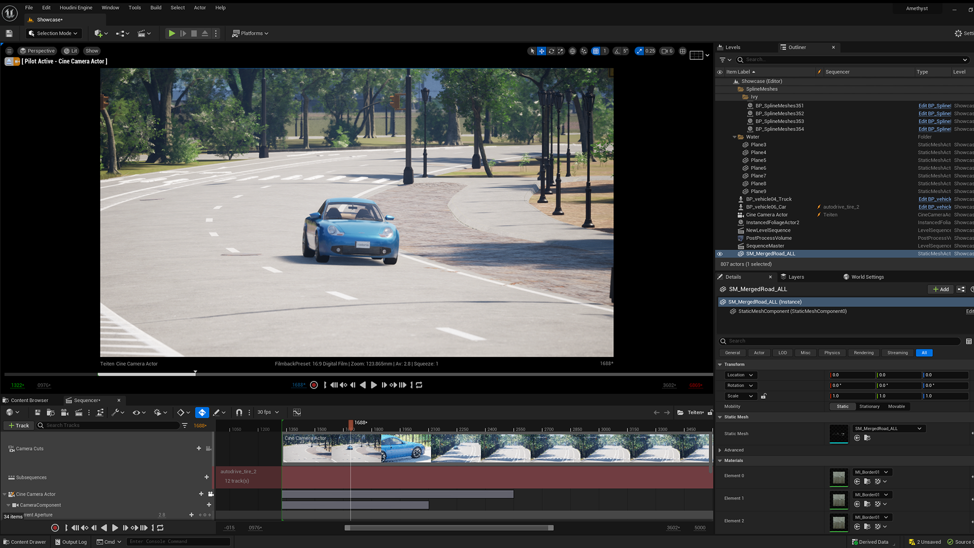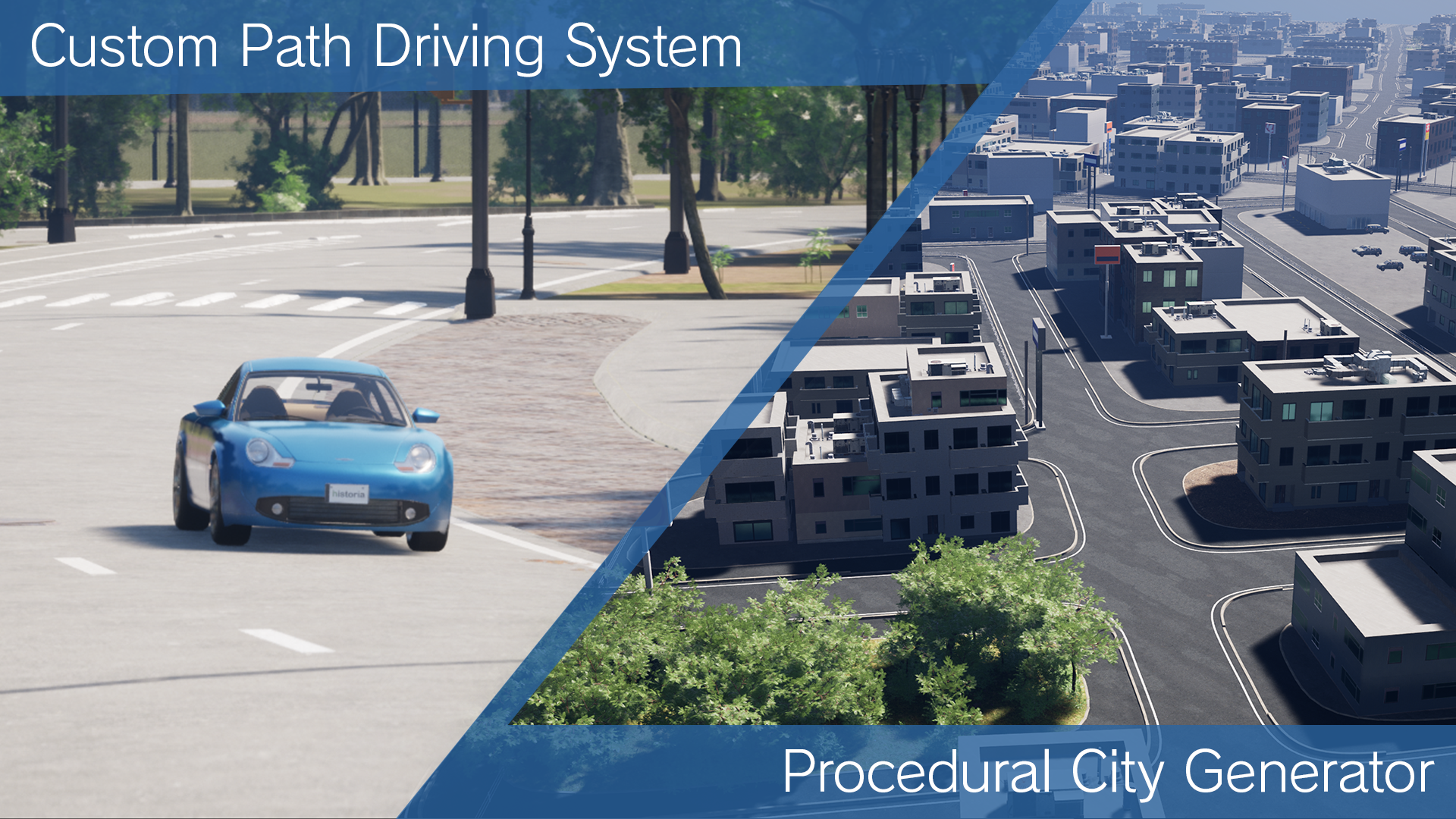 「Custom Path Driving System」は手動で道路にパスを引き、それに沿ってタイヤの方向や物理的な車体の沈み込みを再現しながら自動走行するシステムです。UE5標準機能でも物理的な自動車挙動を再現するものは存在しますが、基本的には自分で運転することを想定しており、任意のパスに沿わせて走行することや、それをもとに思い通りの映像を作ることは困難でした。