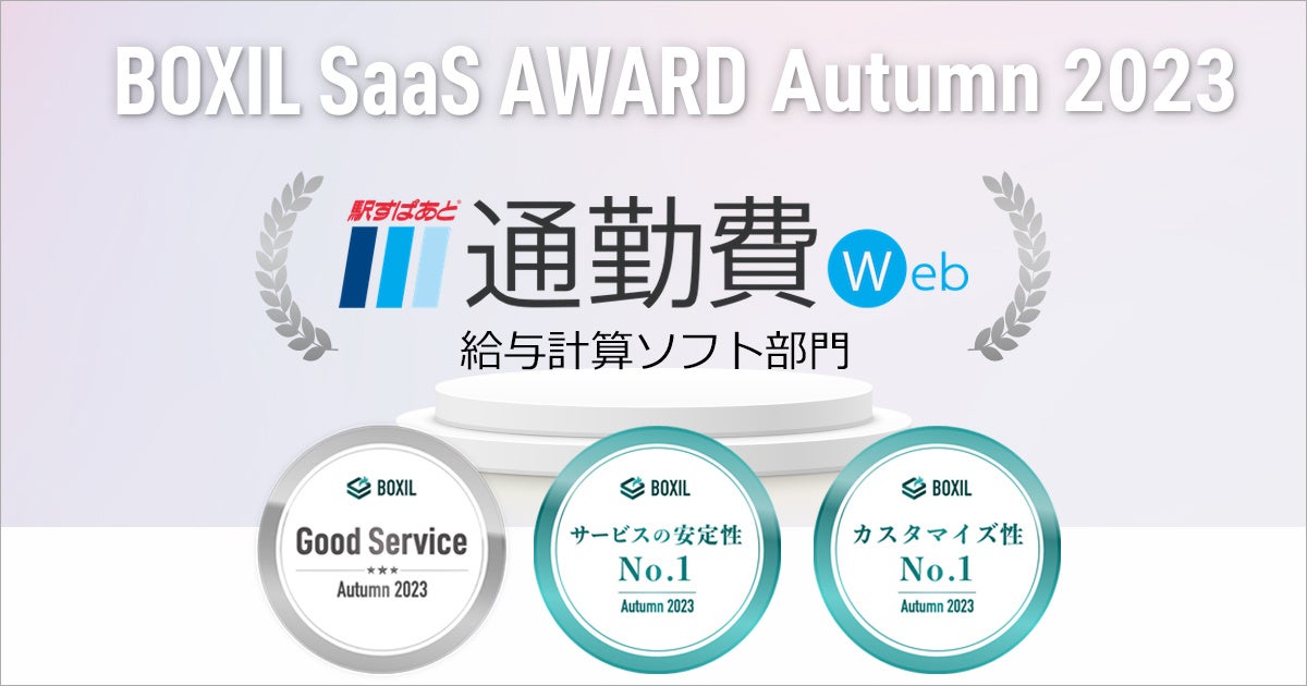 「BOXIL SaaS AWARD(ボクシル サース アワード)」は、SaaS※比較サイト「BOXIL SaaS(ボクシル サース)」を運営するスマートキャンプが、優れたSaaSを審査、選考、表彰するイベントです。今回の「BOXIL SaaS AWARD Autumn 2023」は、2022年7月1日から2023年6月30日までの1年間で新たに投稿された口コミ約17,000件を審査対象としています。今回「駅すぱあと 通勤費Web」は給与計算ソフト部門の「Good Service」「サービスの安定性No.1」「カスタマイズ性No.1」に選ばれました。
