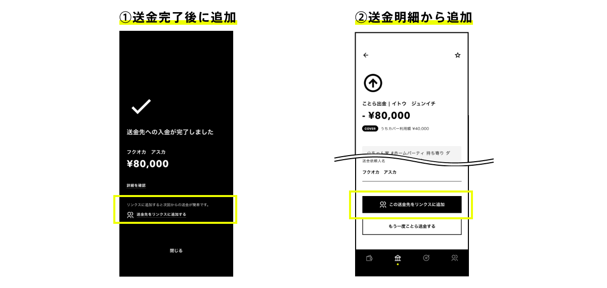 ことら送金手続き完了後、または、過去のことら送金履歴から、リンクスにことら送金先を追加することができます。これにより、次回以降、リンクス画面でことら送金先を選択するだけで簡単にことら送金ができるようになります。