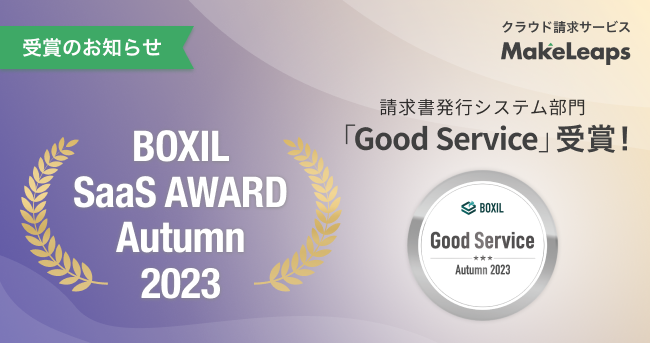 「BOXIL SaaS AWARD(ボクシル サース アワード)」は、SaaS比較サイト「BOXIL SaaS(ボクシル サース)」を運営するスマートキャンプが、優れたSaaSを審査、選考、表彰するイベントです。今回の「BOXIL SaaS AWARD Autumn 2023」は、2022年7月1日から2023年6月30日までの1年間で新たに投稿された口コミ約17,000件を審査対象としています。今回「MakeLeaps」は請求書発行システム部門の「Good Service」に選ばれました。
