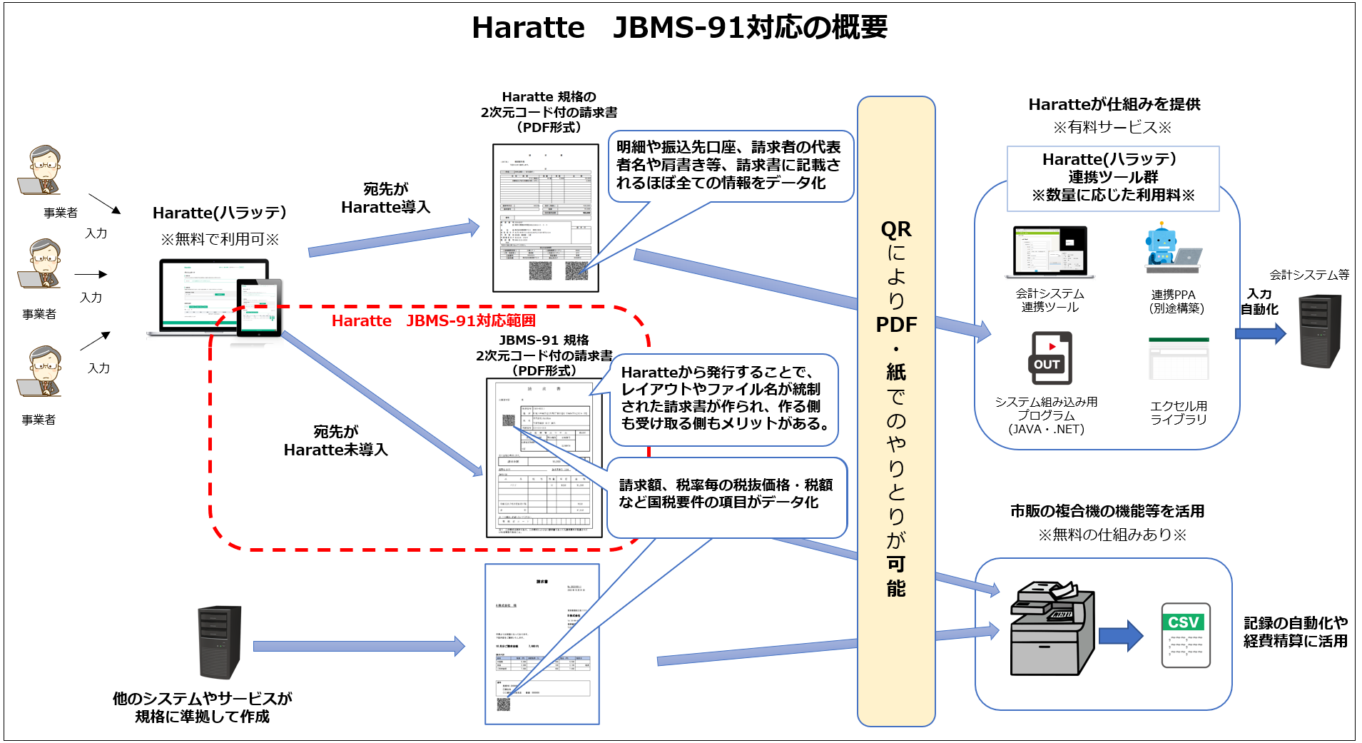 JBMS-89の規格は汎⽤性の観点から格納可能な情報が限られ、⾃治体をはじめとする⾏政機関や、請求データを活⽤した会計システム⼊⼒の⾃動化、⼀層の業務効率化を望む⺠間企業など、Haratteが従来より⽀援している団体・企業については今後もHaratteによる⽀援を提供しつつ、今回の対応により、インボイス制度開始にあわせて電⼦取引を簡単には導⼊できない中⼩企業の事務⼿続きの負担軽減が可能となります。
