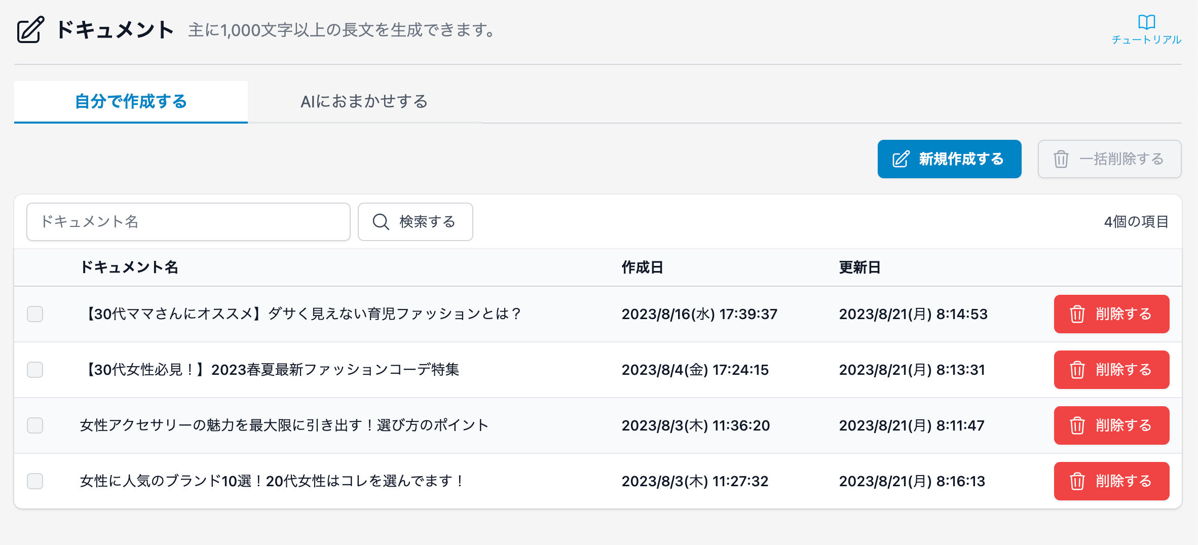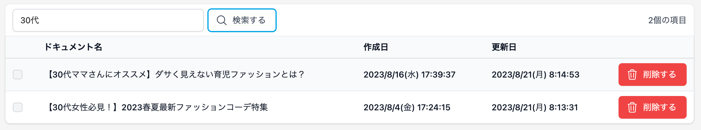 検索ボックスに、お探しのドキュメントのタイトルの一部を入力し、[検索する]ボタンをクリックしていただくと、検索した文言を含むドキュメントを検索できます。