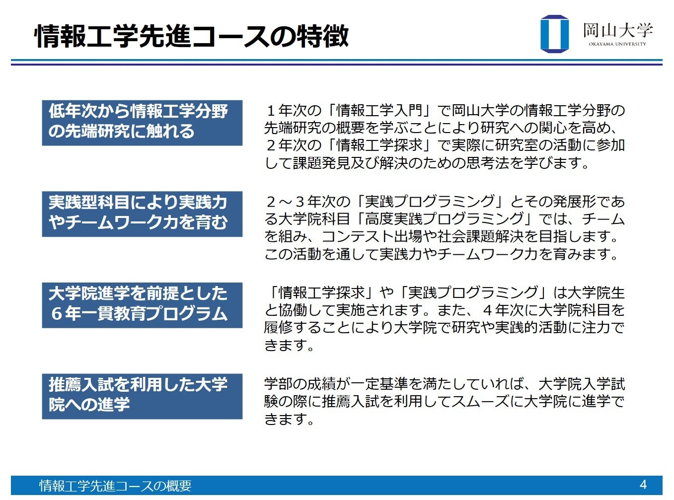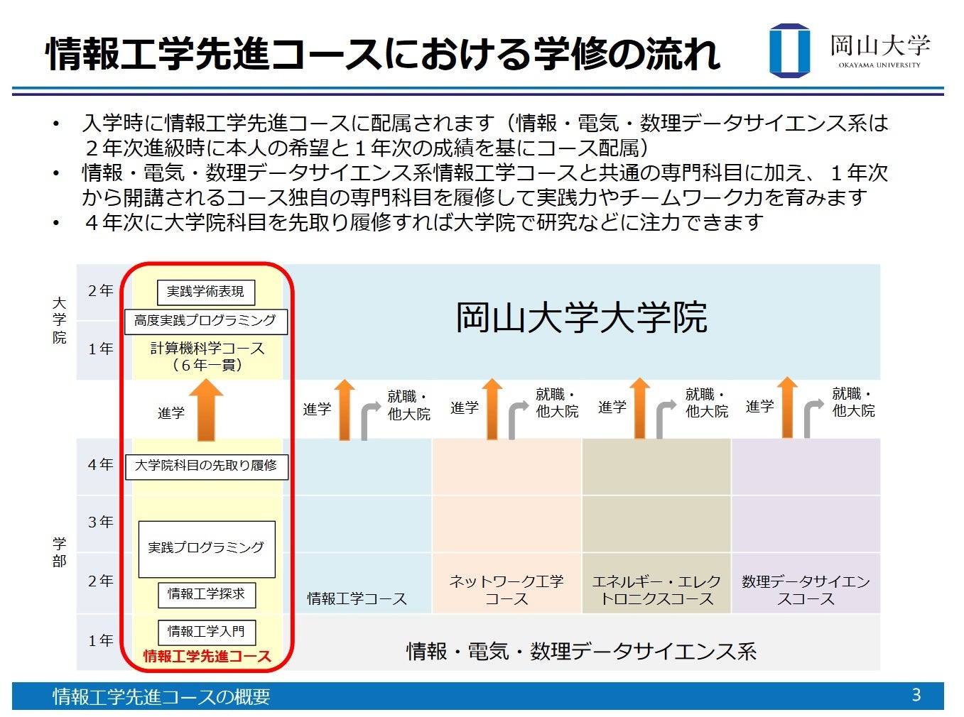 岡山大学工学部情報工学先進コースの概要(コースの特徴、入学者選抜方法等)