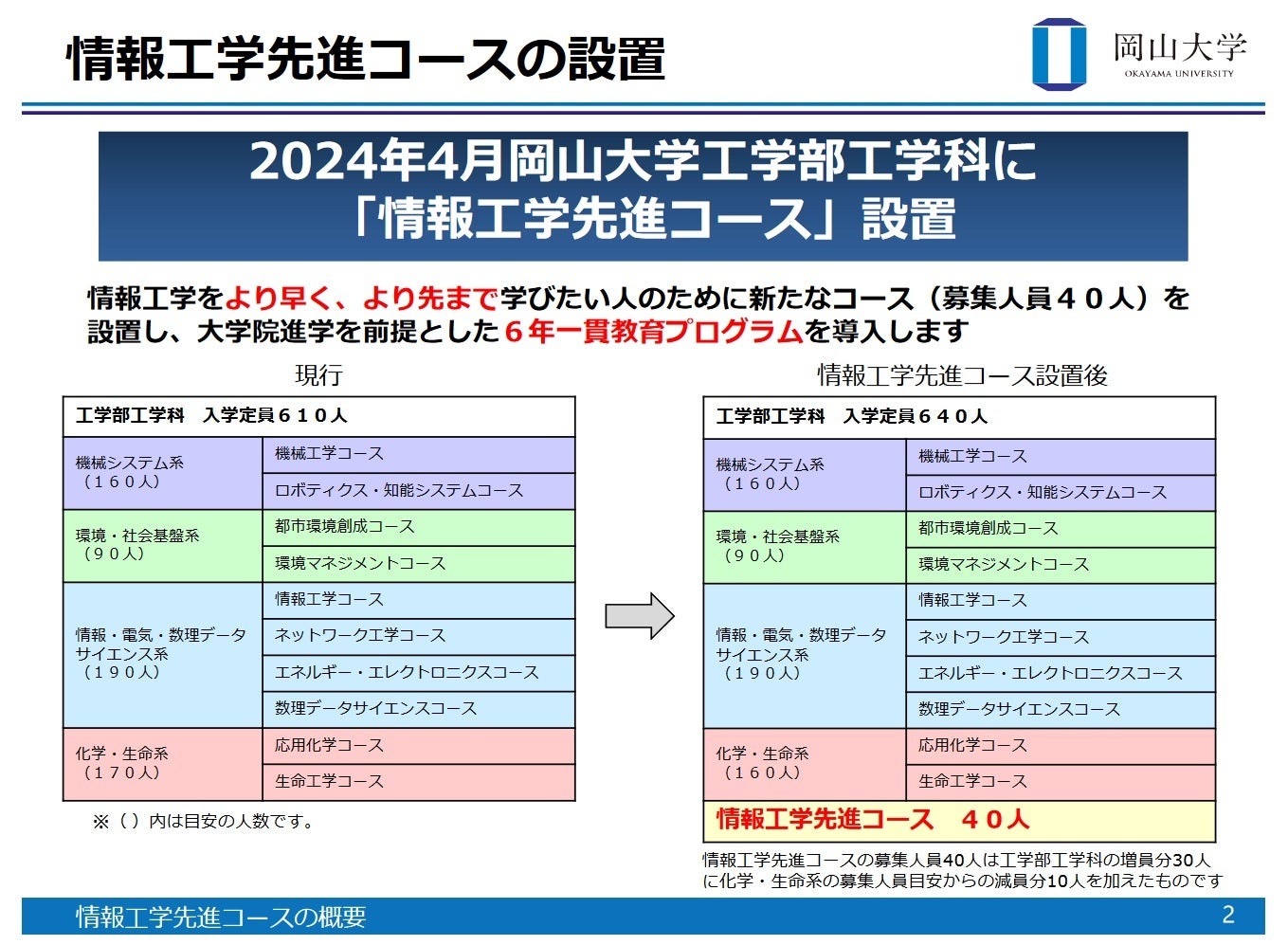 国立大学法人岡山大学(本部:岡山市北区、学長:那須保友)の工学部工学科では、2024年度から入学定員を増員し、新たに「情報工学先進コース」の設置を計画しておりましたが、この度、文部科学省に設置が認可されました。