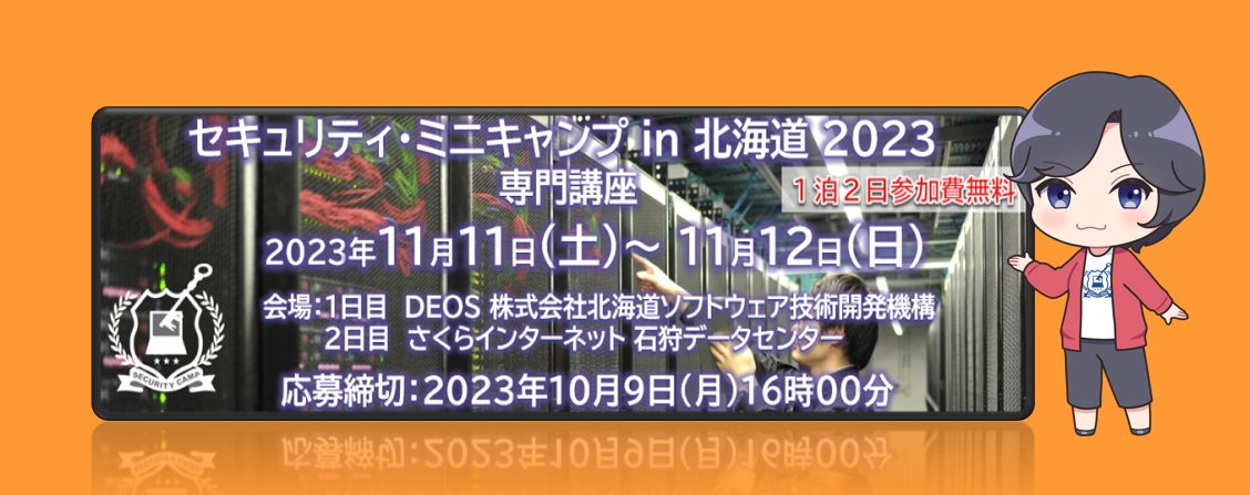 2023年11月11日(土)~12日(日)の2日間 現地開催にて、一般社団法人LOCAL、北海道大学情報基盤センター サイバーセキュリティセンター、一般社団法人セキュリティ・キャンプ協議会、独立行政法人情報処理推進機構(IPA)が主催する「セキュリティ・ミニキャンプ in 北海道2023」の専門講座の参加者を募集いたします。