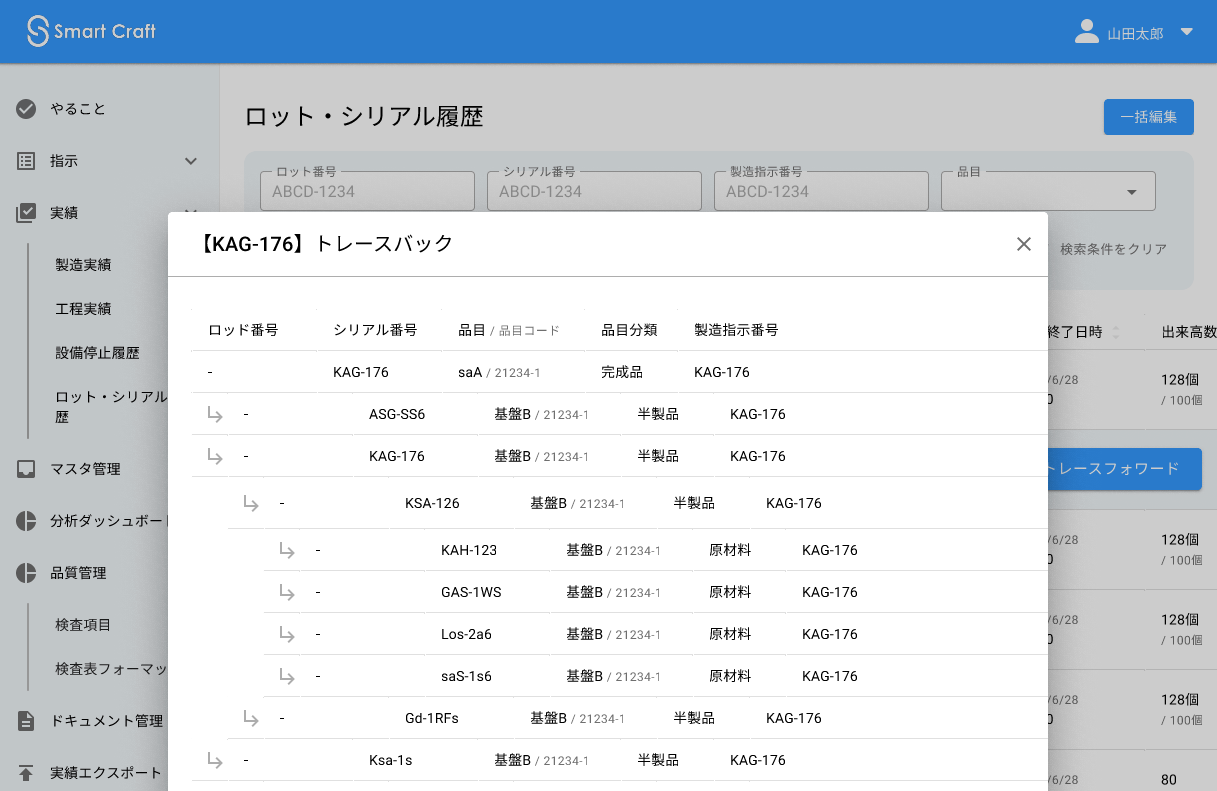 しかし、ロットトレース機能によりロット番号を検索するのみで、瞬時にその製品に使われた半製品や部材情報、及びその製造実績の詳細を確認することが可能となります。