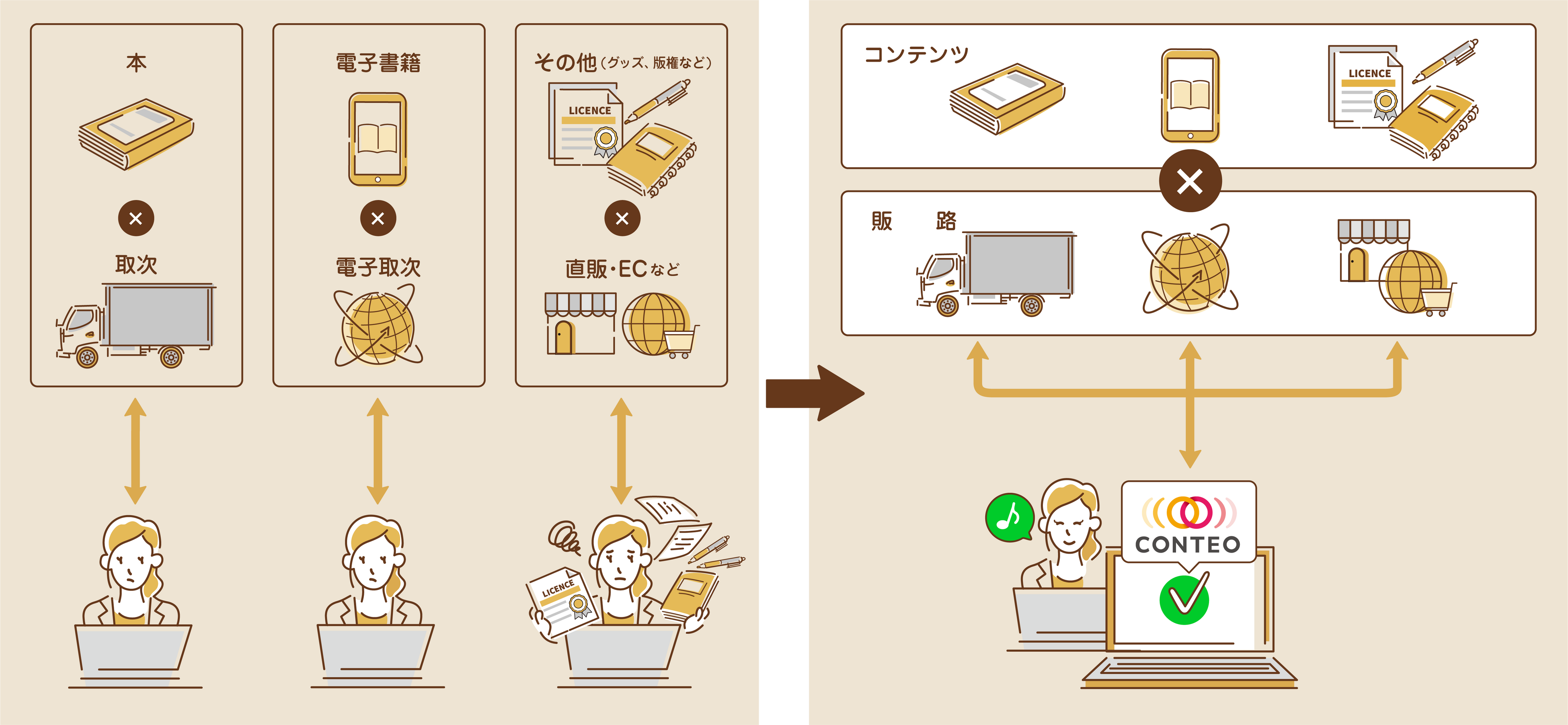 各コンテンツや販路ごとに分散していた管理システムをCONTEOひとつに統合することでコスト削減を実現します。また管理にExcelやAccessなどを使用している場合もCONTEOに統合することで省力化することが可能となります。