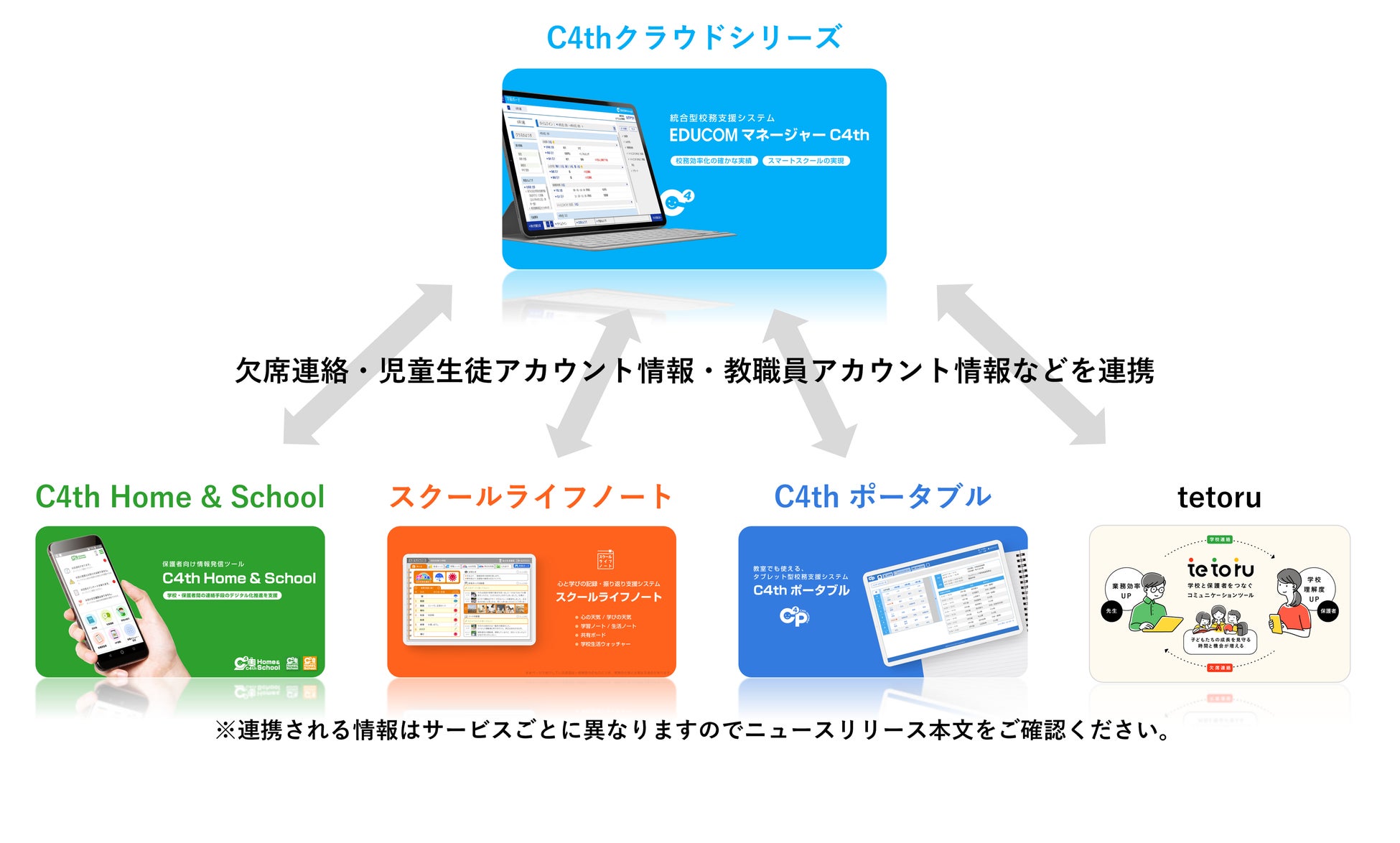「C4thクラウドスタンダード」と「C4thクラウドプレミアム」は、「C4th Home & School」「スクールライフノート」「C4th ポータブル」「tetoru」とのそれぞれにおいて以下の情報を自動連携できるようになりました。