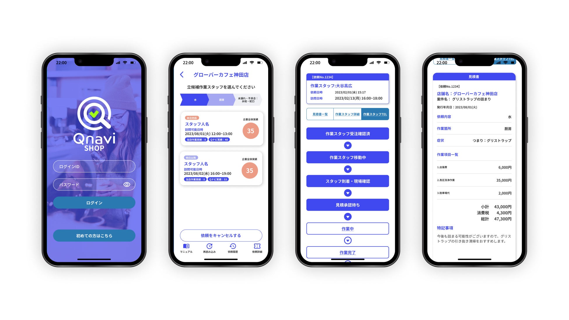 「Qナビ」は、店舗ビジネスで突発的に発生する空調や水回り、漏電等のトラブル時に最短30秒(※1)で業者とマッチング、定期メンテナンスの管理ができるアプリサービスです。