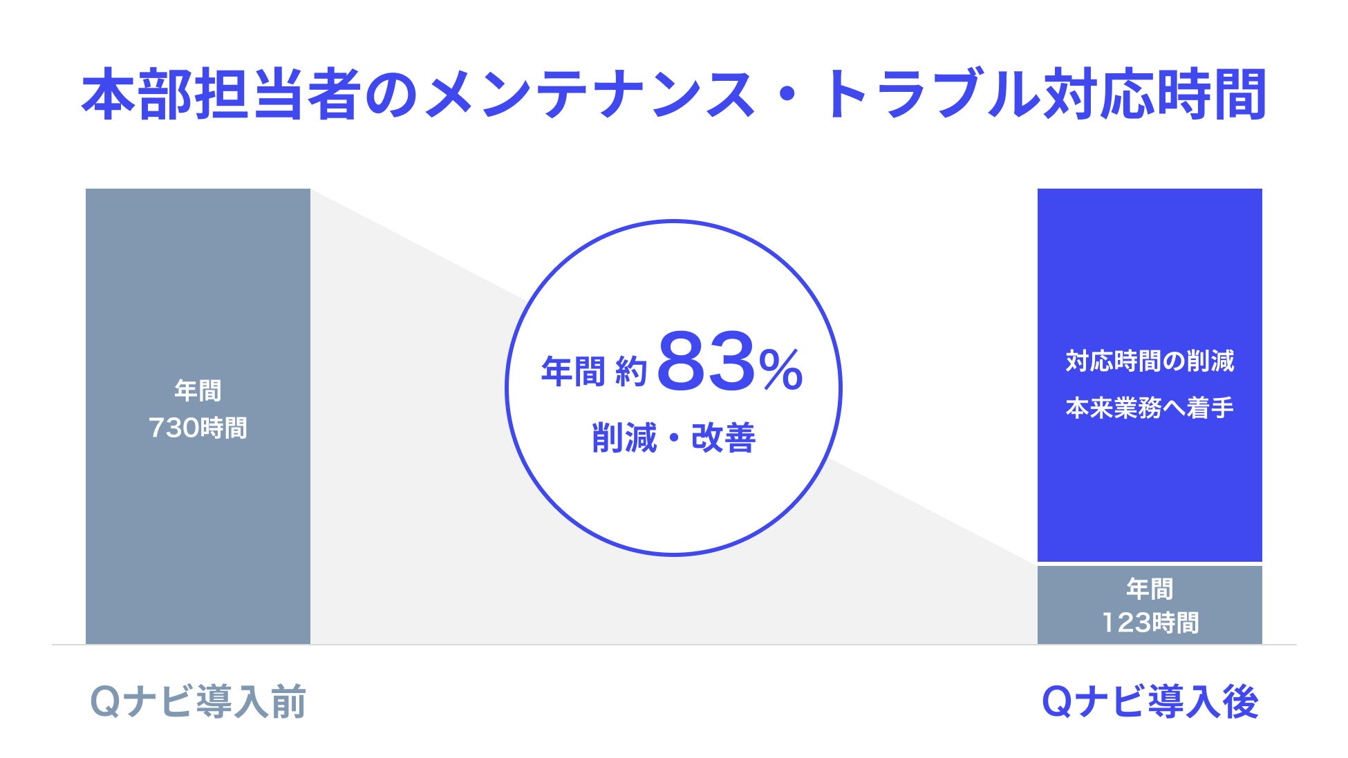 Qナビの導入により、店舗におけるメンテナンス対応時間が年間で83%(※2)削減された事例もあり、大幅な業務改善を実現できます。これまでの店舗トラブル発生時には、緊急対応可能な業者を探しての現地対応、トラブル対応後は、業者への費用支払いに係る経理担当者との情報共有、書類の提出等の多くの業務が発生します。Qナビはそのような業務をアプリ1つで完結し、メンテナンスに係る時間を削減し、本来業務(売上拡大、マーケティング、人材教育、メニュー開発 等)に専念できる環境を実現します。
