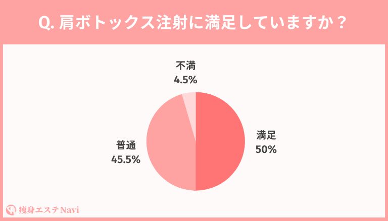 ・肩ボトックス注射に「満足している」と答えた方は、50%、「普通」と答えた方は45.5%、「不満」と答えた方は4.5%となりました。