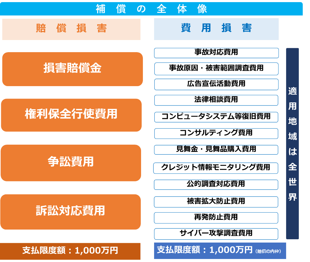 BBSecによる脆弱性診断の契約日から1年間、情報漏えいやサイバー攻撃に起因する賠償損害や、事故発生時に対策を講じた場合の費用損害について、実際の初動対応には平均して1,000万円程度必要であるという当社データをもとに、最大1,000万円まで補償されるプランを付帯いたしました。