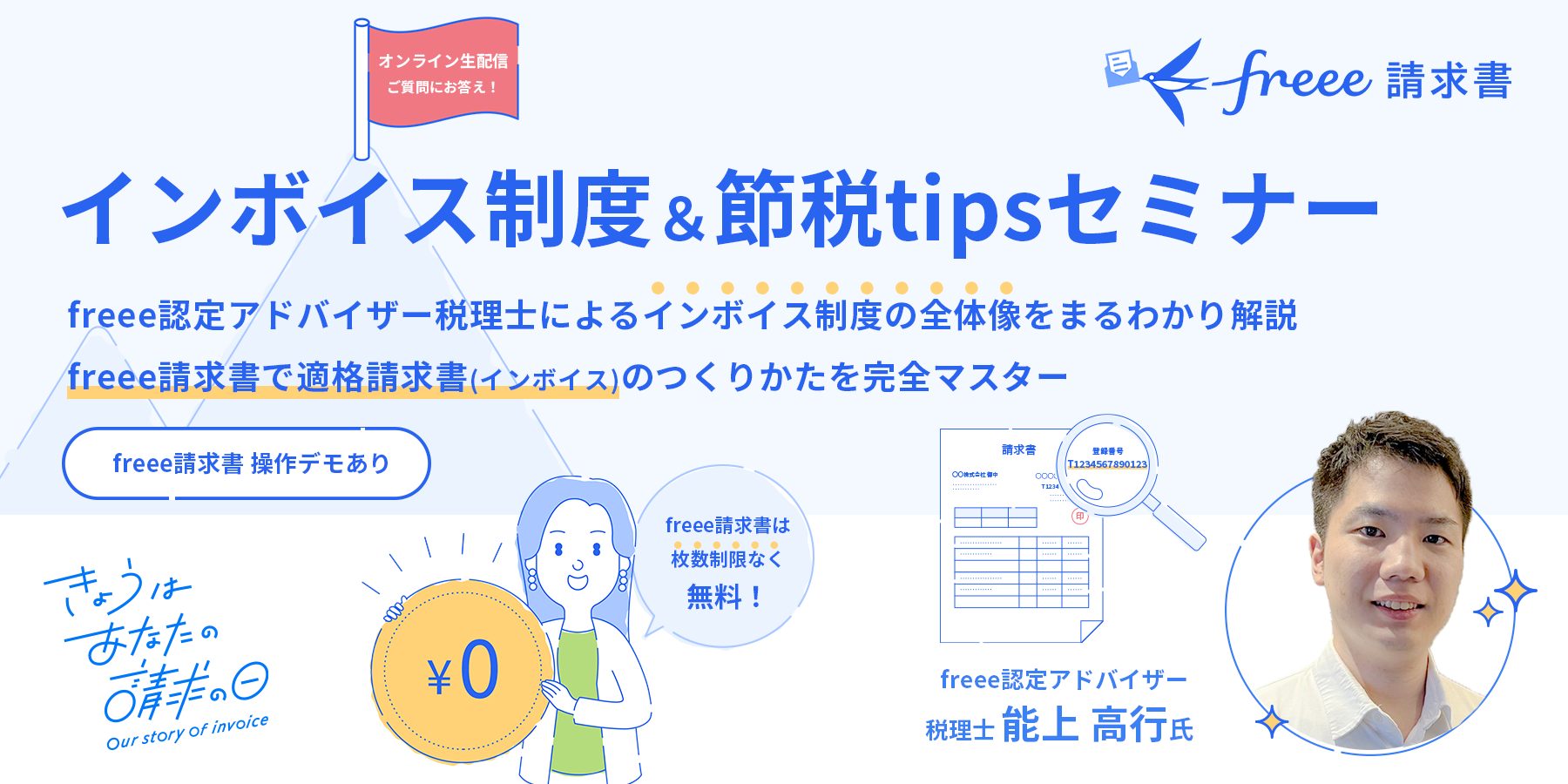 freee請求書を使った適格請求書の作成方法やインボイス制度に関する基礎的な情報・その他必要な対応についてfreee認定アドバイザーが解説を行います。無料でどなたでもオンラインでご参加いただけます。インボイス制度対応に不安をお持ちの方はぜひご参加ください。