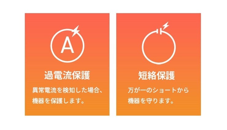 過電流保護・短絡保護の2つの保護機能を搭載しています。これにより、安全に多数のデバイスを充電することができます。