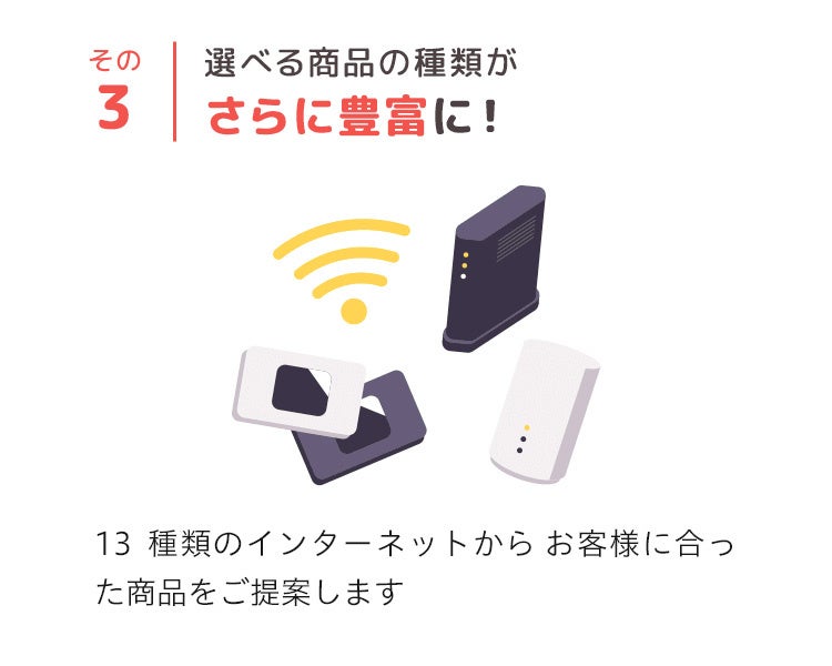 ポケット型Wi-Fiだけではなく、光回線の商品もご用意しています。全13種類のインターネットから、お客様のライフスタイルに合った商品をお選びいただけます。