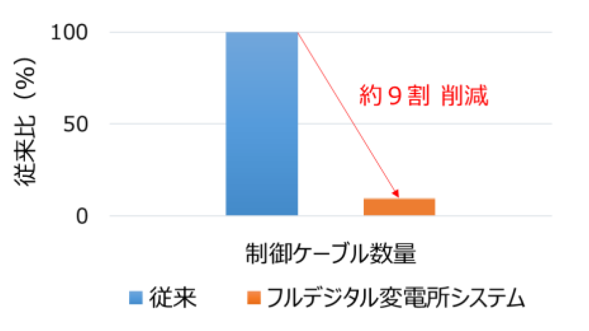 本システムでは、監視操作盤・保護リレー盤を、統合ユニット(日立開発)に集約・小型化することにより、盤の数量を大幅に削減しました。また、ネットワーク装置から現場ユニットまで大量の制御ケーブルを必要としない光デジタル通信を採用することで、制御ケーブルを約9割削減することが可能となりました。これにより、省スペース化および工事の省力化を実現します。
