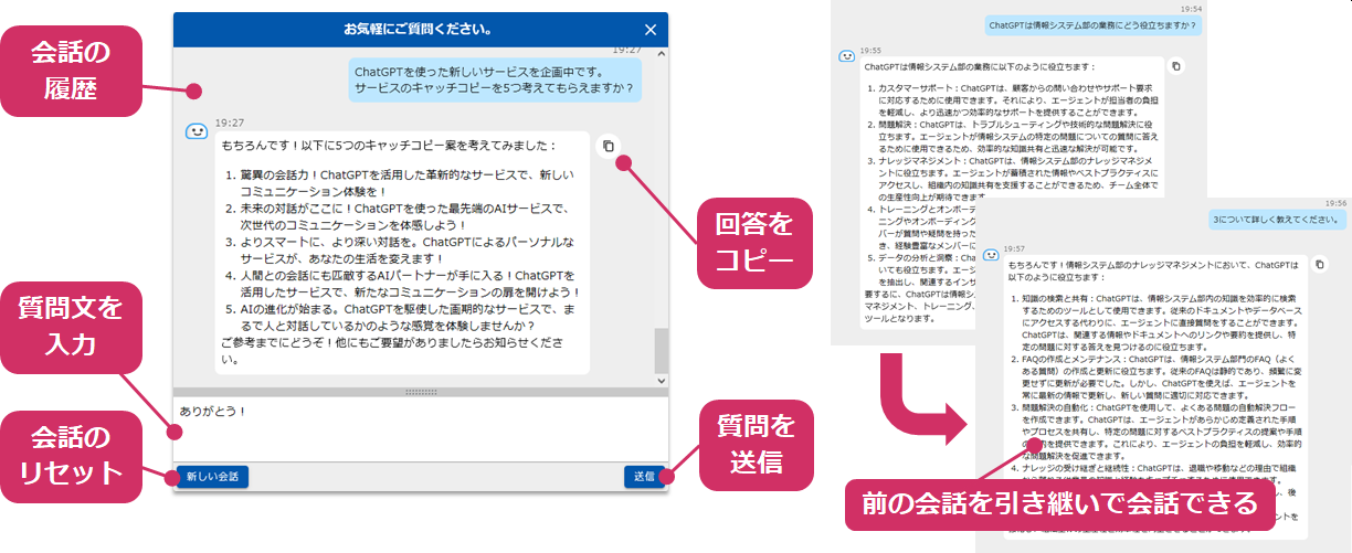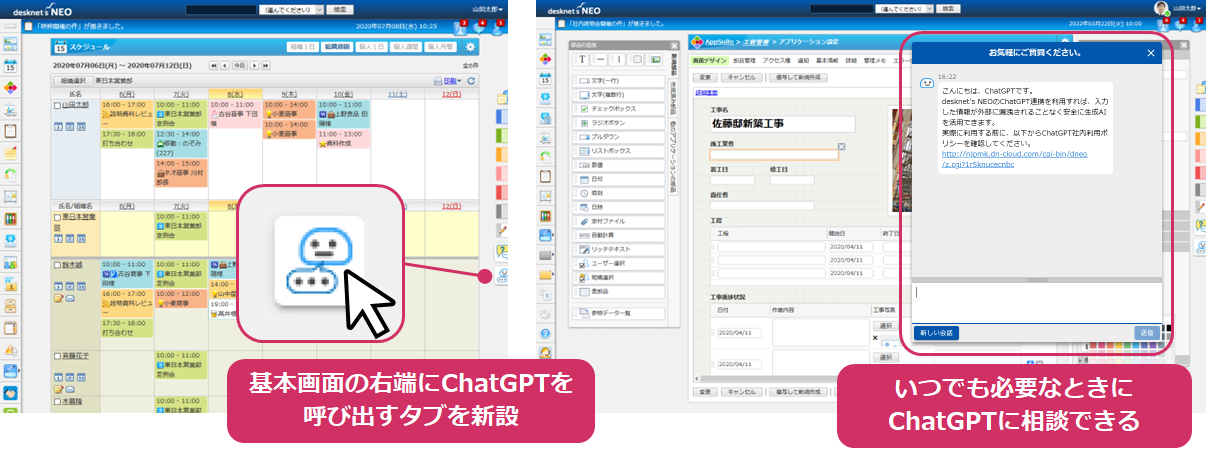 『desknet’s NEO』では、どの基本画面からでも『ChatGPT』を起動できます。他の作業をしながらいつでも『ChatGPT』の情報を参照できるインターフェースを提供します。