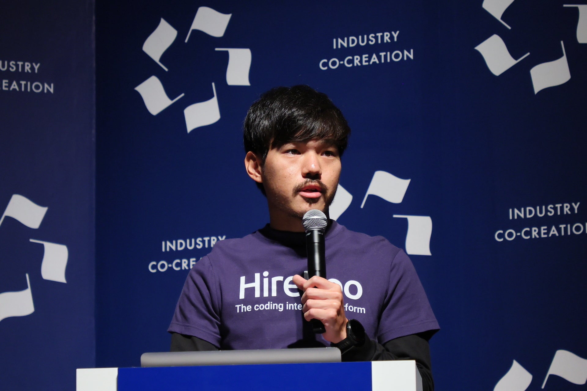 弊社からは代表取締役の葛岡が登壇。エンジニア採用におけるミスマッチ、それによるコスト増大といった課題を解決するコーディング試験サービス「HireRoo」についてピッチを行いました。