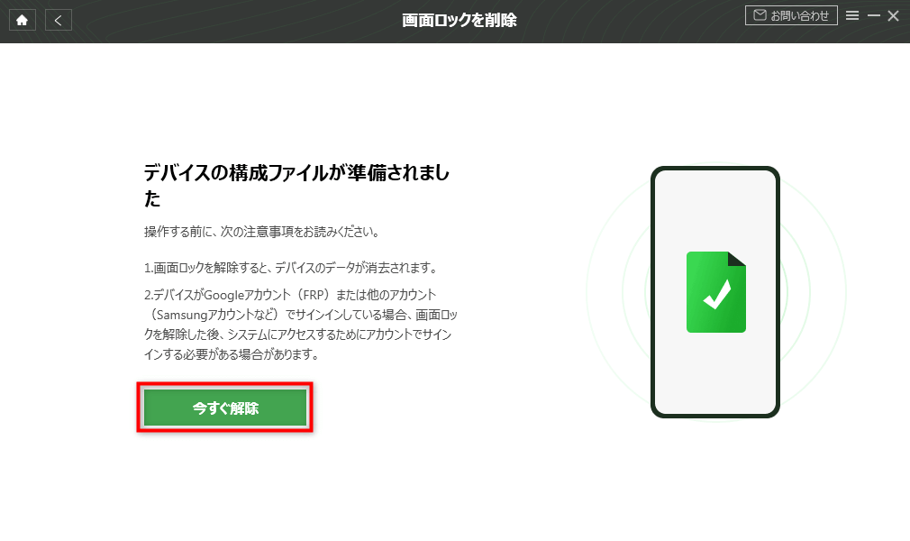 ステップ3、画面ロックを削除するために構成ファイルが必要になります。デバイスの構成ファイルが準備されたら、「今すぐ解除」をクリックします。