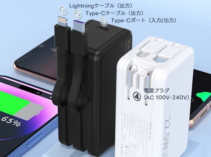 充電器の使い勝手を向上させるために、本製品にはType-CケーブルとLightningケーブルを備えており、別にケーブルを用意する手間を省くことができます。また、同時充電にも対応しており、最大3台のデバイスを同時に充電することができます。