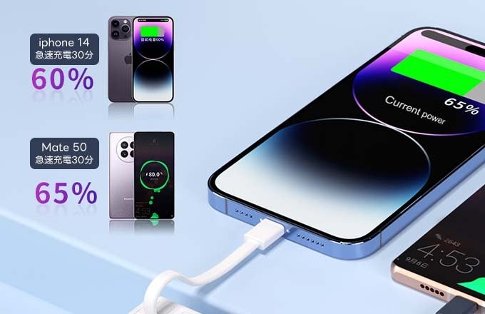 たった30分で、iPhone 14やHUAWEI mate 50のバッテリー残量は0から約60%以上まで充電することができます。