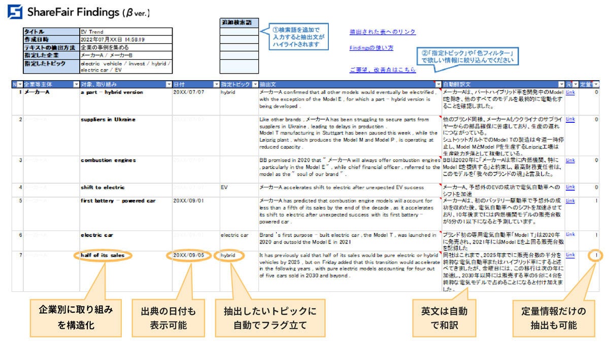 資料内にあるテキストデータを、企業別、および、製品・取り組み別の2段階で分類することで「構造化」します。フィルター機能を使えば、欲しい情報に簡単に絞り込むことができ、企業の事例調査の整理等に役立ちます。