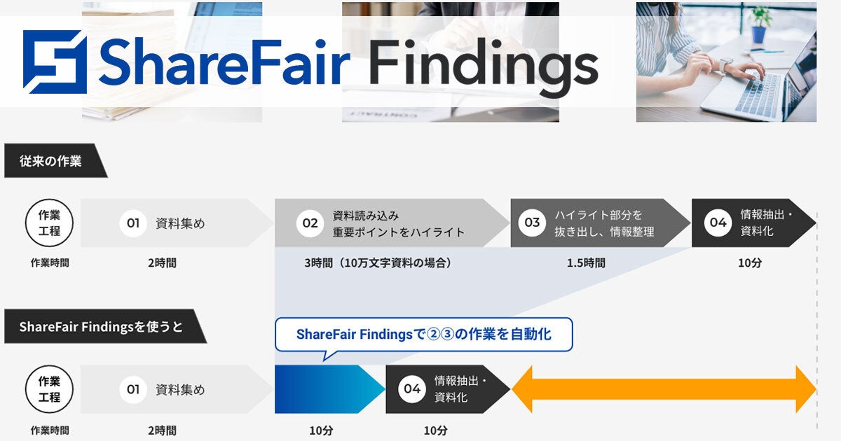 経営企画や新規事業開発の担当者、リサーチ・コンサルティング会社の方など、市場分析や事例調査に携わる方にとって、多くの時間を取られるのが、デスクリサーチ・文献調査ではないでしょうか。新聞・ニュース記事や調査レポートなどを大量に集め、それらを読み込み、必要な情報を整理して資料にまとめる、この一連の作業に何時間もかかっているのが実情かと思います。そこで株式会社ShareFairは、特許も取得した独自技術を使ってテキストデータを整理・構造化することで、絞り込みやまとめ作業の工数を大幅に削減して業務効率化を図る自動テキスト整理ツール「ShareFair Findings」を開発いたしました。