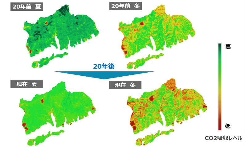 ・衛星データを活用・分析し、広大な範囲のCO2吸収量を容易に測定・可視化できることを確認しました。