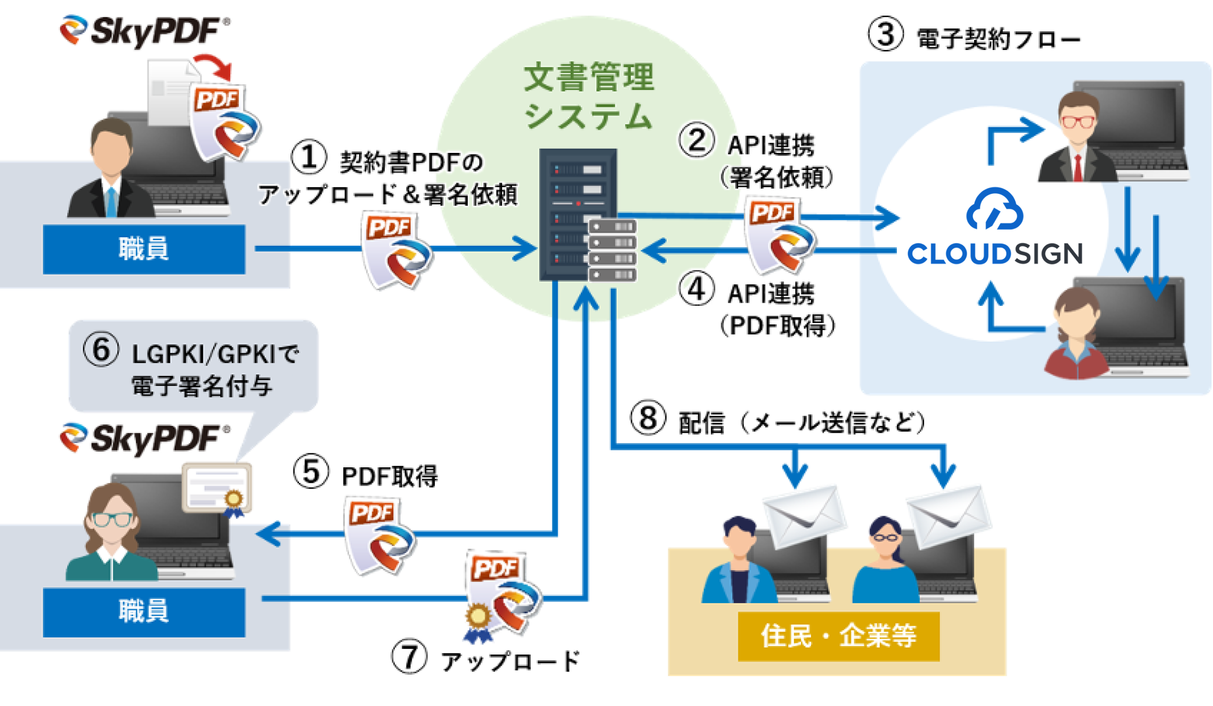本協業により、PDF技術を自社内で開発する専門性と技術力で強みを発揮し、これまで数多くの企業、金融機関、官公庁・自治体に採用されているスカイコムの「SkyPDF®(スカイピーディーエフ)」と、電子契約市場において企業や自治体などで幅広く導入されているシェアNo.1(※)の弁護士ドットコムが提供する契約マネジメントプラットフォーム「クラウドサイン®」が連携することで、契約書PDFファイルに官職証明書(GPKIが発行)や職責証明書(LGPKIが発行)を使用した電子署名とクラウドサイン®による事業者署名のハイブリッド署名が可能となりました。