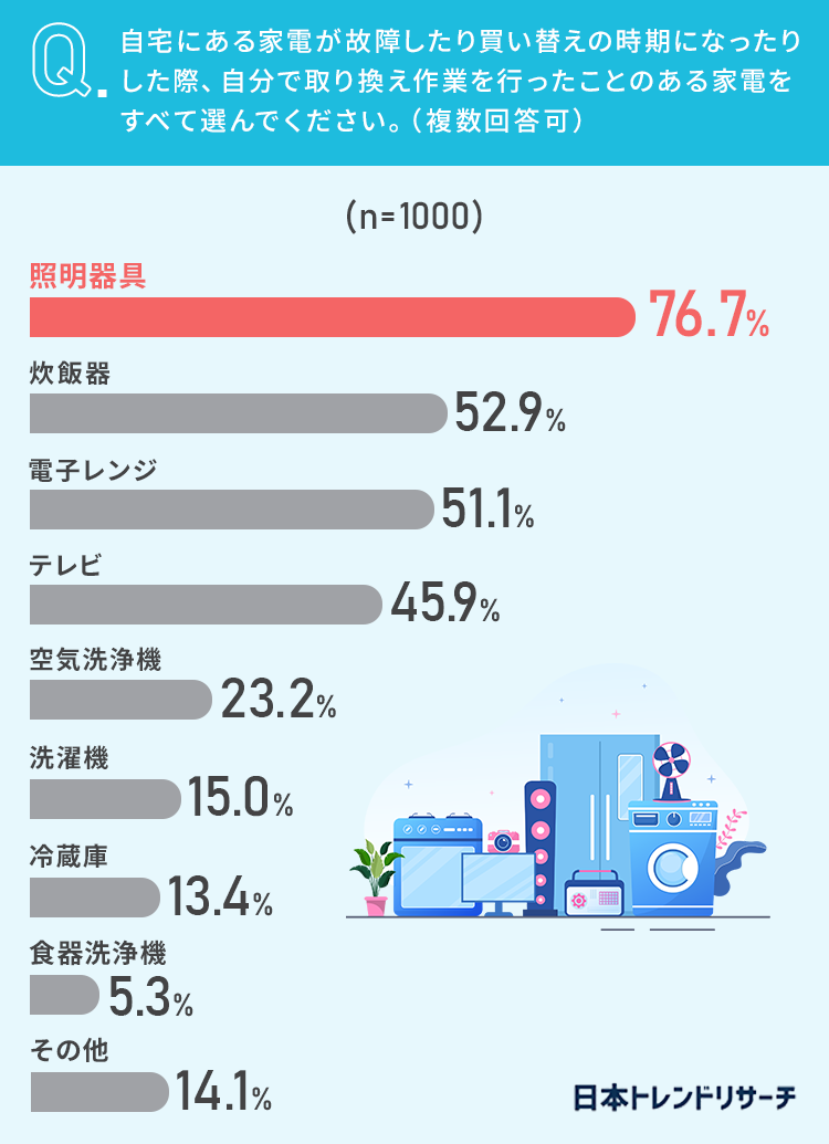 続いて、自宅にある家電が故障したり買い替えの時期になったりした際、自分で取り換え作業を行ったことのある家電をすべて選んでもらいました。