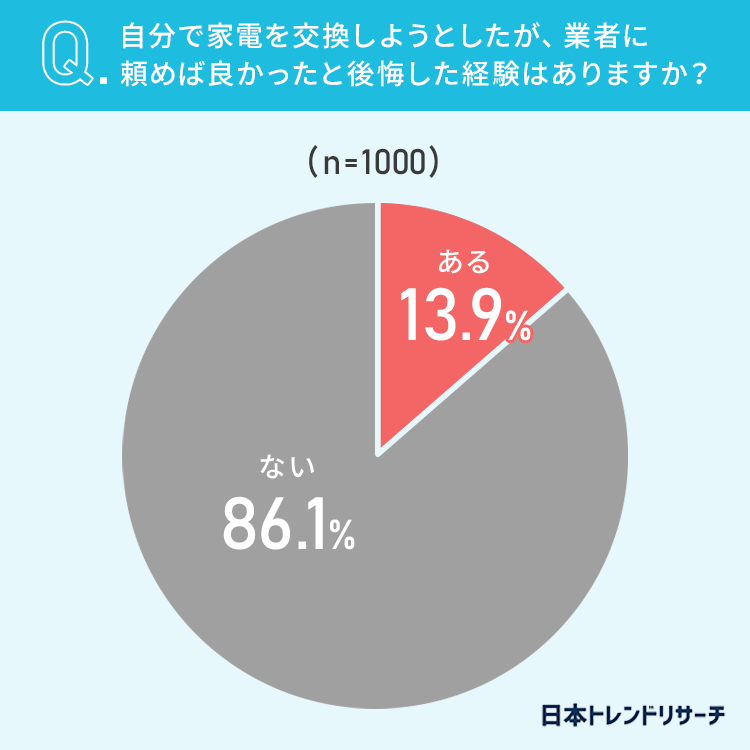 13.9%の方が「自分で家電を交換しようとしたが、業者に頼めば良かったと後悔した経験がある」と回答しています。