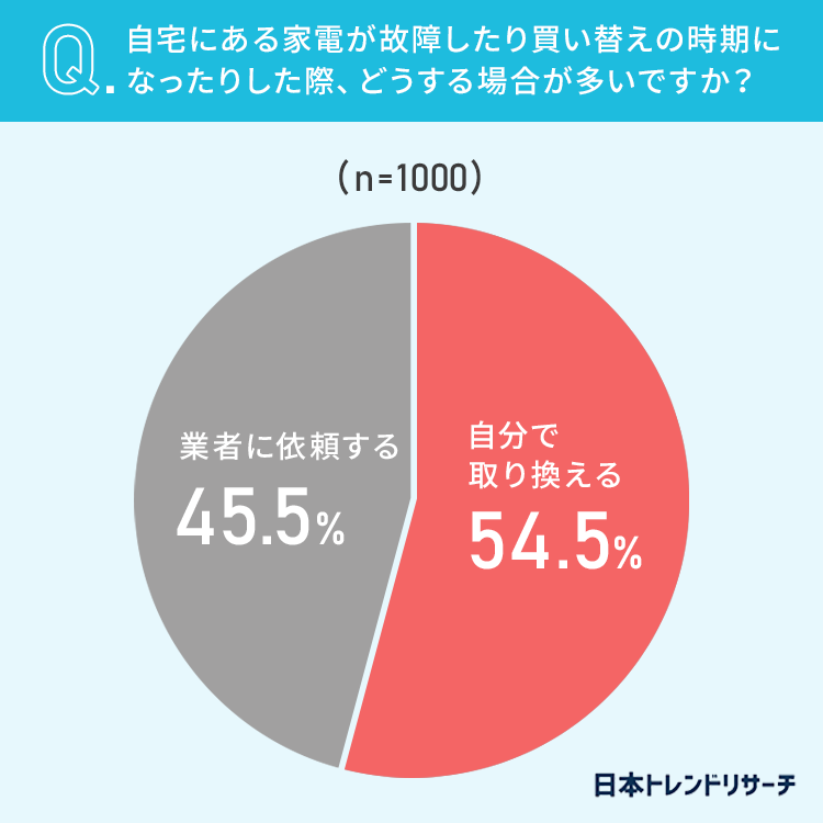 まずは、自宅にある家電が故障したり買い替えの時期になったりした際、自分で取り換えるのと業者に依頼するのではどちらが多いか聞いてみました。