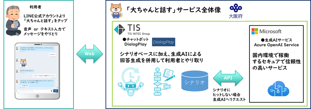 大阪府のスマートシニアライフ事業においてLINE公式アカウント「おおさか楽なび」のサービス提供が開始され、高齢者の会話機会や外出機会を創出するコミュニケーション支援サービス「大ちゃんと話す」にAI搭載型チャットボット作成サービス「Dialog Play」が実装されました。これまでは、シナリオにない話題や様々な固有名詞に対してうまく対応できない場面がありました。