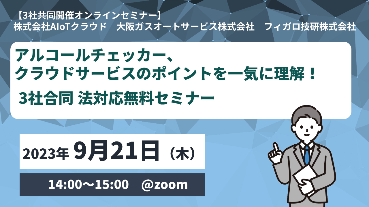アルコールチェック管理サービス『スリーゼロ』(https://alc.aiotcloud.co.jp/)を提供する株式会社AIoTクラウド(本社:東京都江東区、代表取締役社長:松本 融)は、大阪ガスオートサービス株式会社(本社:大阪市淀川区、代表取締役:松本 将英)、フィガロ技研株式会社(本社:大阪府箕面市、代表取締役社長 宇高 利浩)と共にウェビナーを9月21日(木)に開催致します。