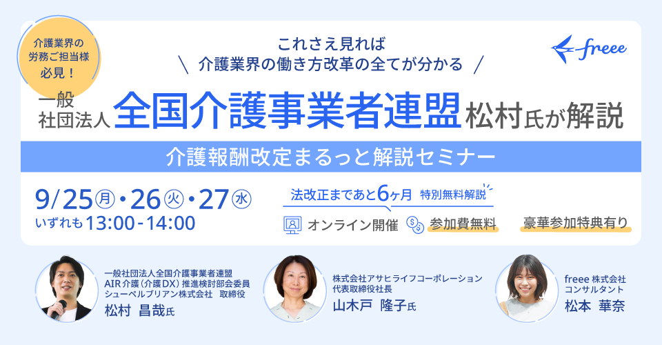 freee株式会社(本社:東京都品川区、CEO:佐々木大輔、以下「freee」)は9月25日(月)26日(火)27日(水)の3日間で「介護報酬改定まるっと解説セミナー」をオンラインで開催します。
