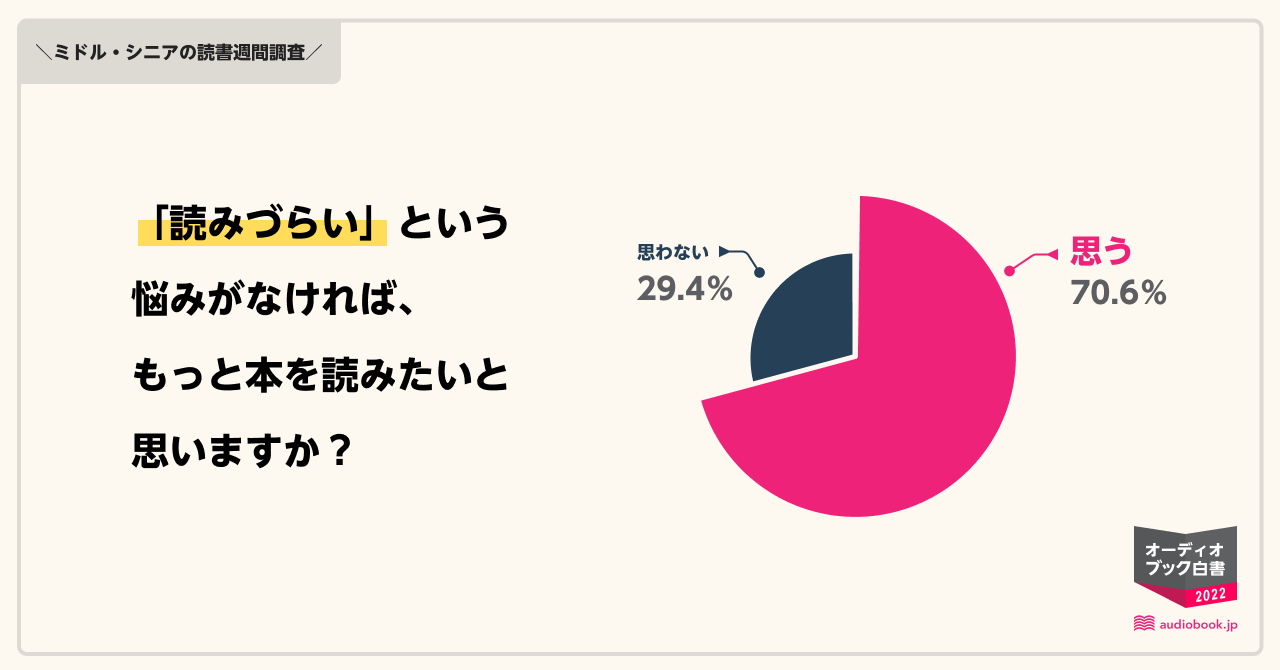 ●読みづらい悩みがなければ「もっと本を読みたい」が70.6%。約4割が耳で聴く本「オーディオブック」を使ってみたいと回答