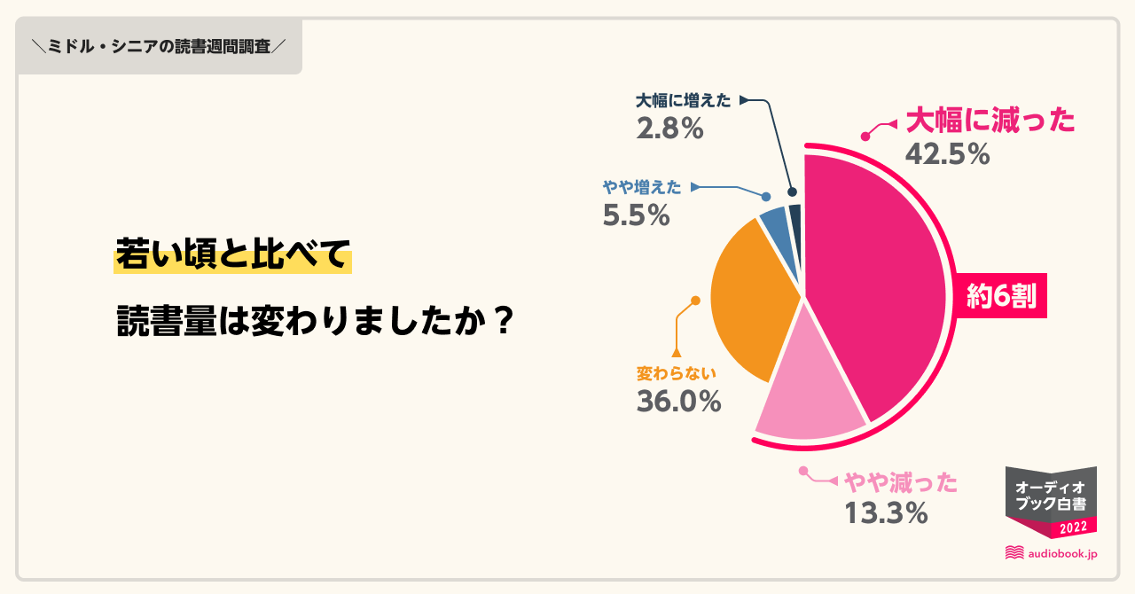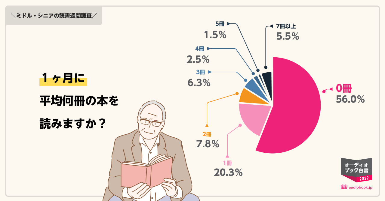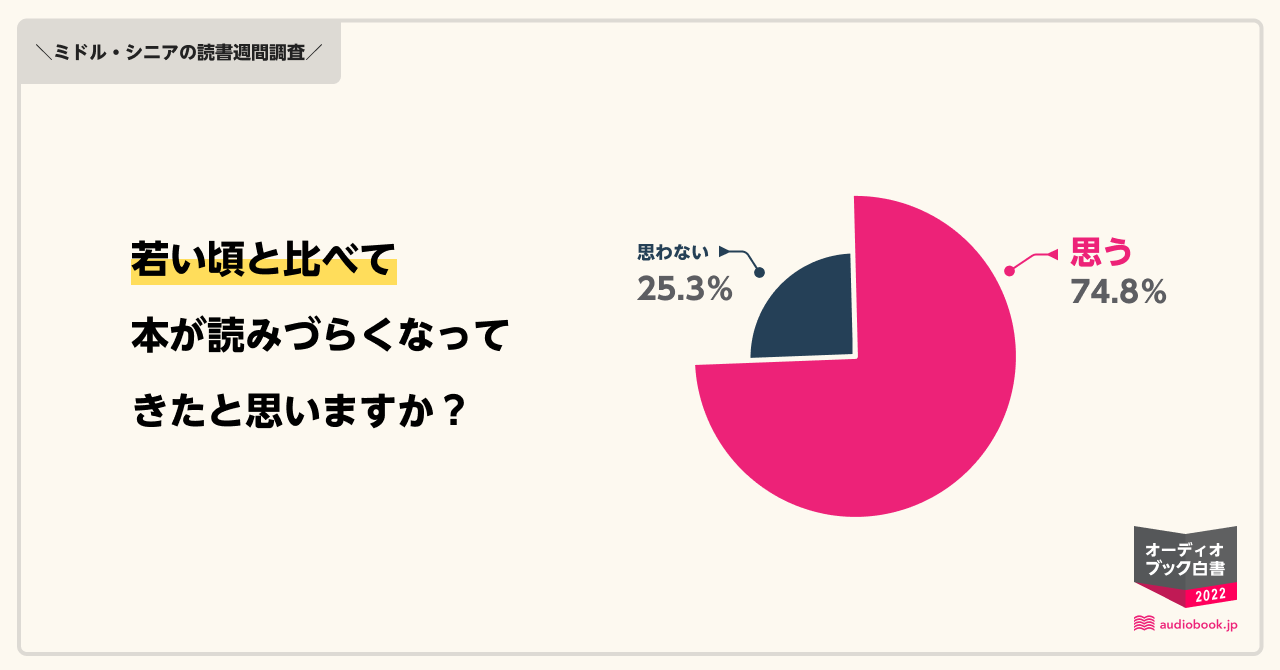 調査の結果、ミドル・シニア世代の回答者の半数以上が「月に1冊も本を読まない」こと、約9割が「老眼や視力の低下」で本が読みづらくなっていることがわかりました。一方で「audiobook.jp」の55歳以上ユーザーは前年の2倍以上に急増しており、目を使わない読書へのニーズが高まってきているものと思われます。