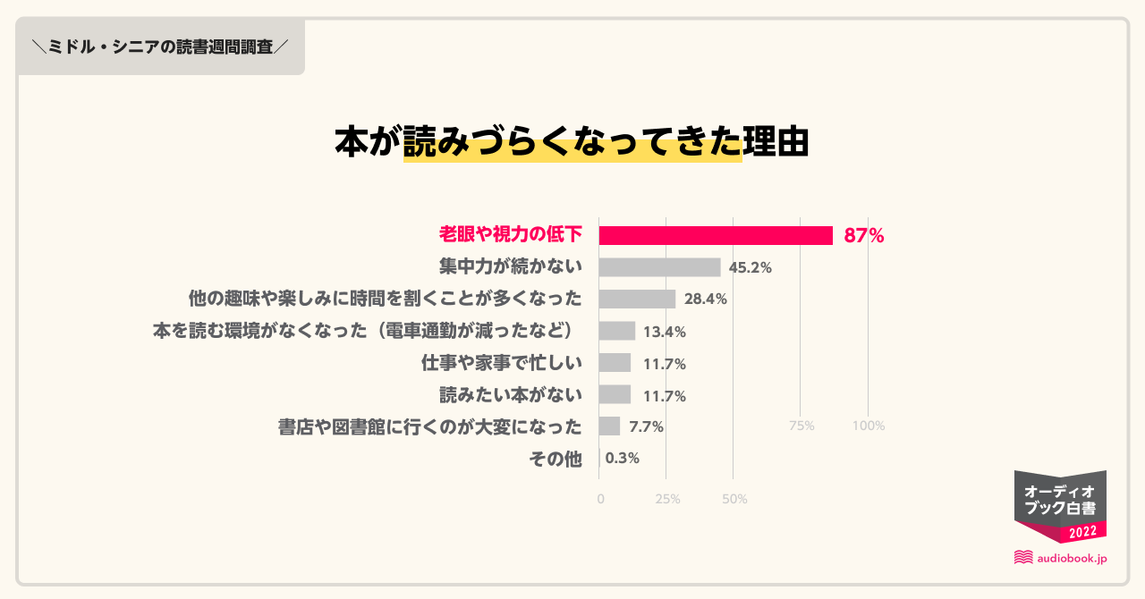 加齢とともに訪れる老眼や視力の低下が、ミドル・シニア世代の読書離れの要因の一つになっていると考えられます。