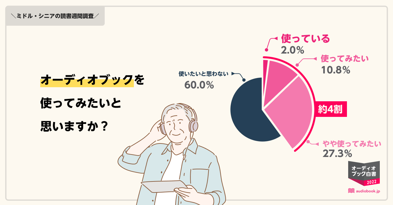 また、書籍を音声化し目を使わずに読書ができる「オーディオブック」について、使ってみたいと思うかを質問すると、約4割が「使ってみたい」(「使っている」2%、「使ってみたい」10.8%、「やや使ってみたい」27.3%)と回答。